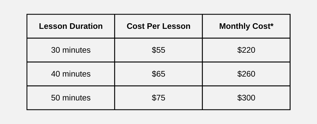 *Monthly cost is based on a month with four weekly lessons. Your bill will be adjusted based on your tuition, financial aid, number of classes in a month, and/or any makeup credits.